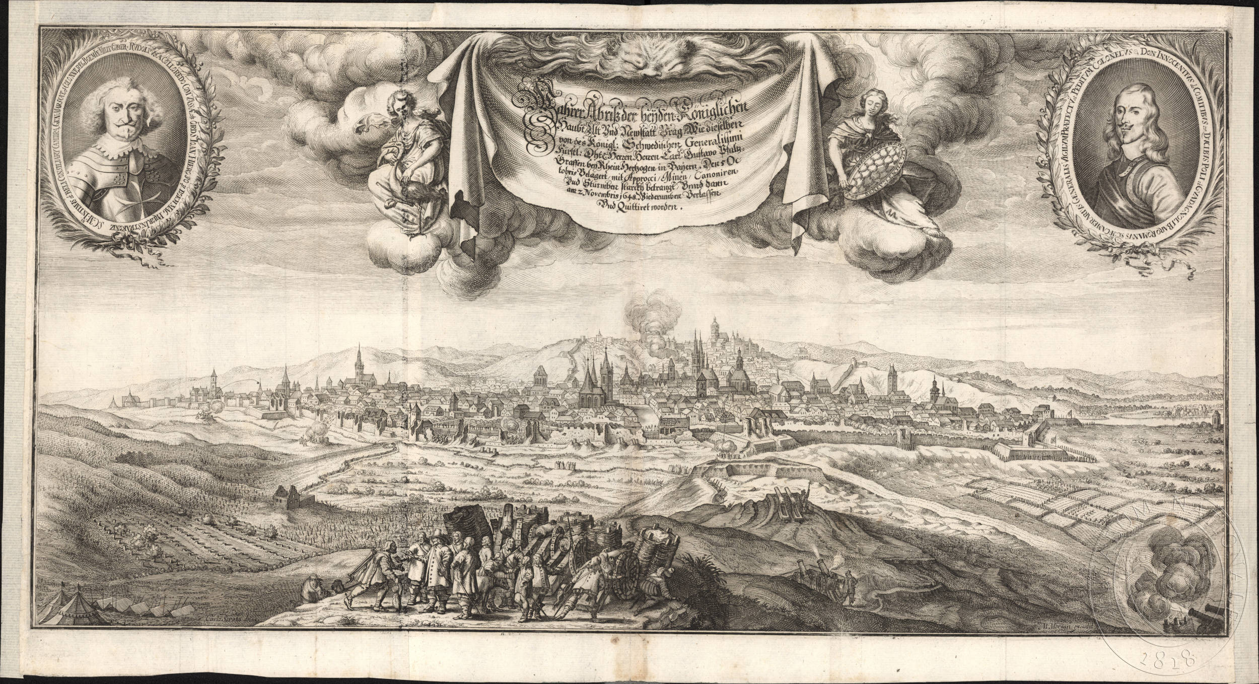 Pohled na švédskými vojsky obléhané Nové a Staré Město pražské v říjnu 1648 z prostoru dnešních Vinohrad, v pozadí Hradčany s Pražským hradem, Petřín, letenská stráň a letohrádek královny Anny.